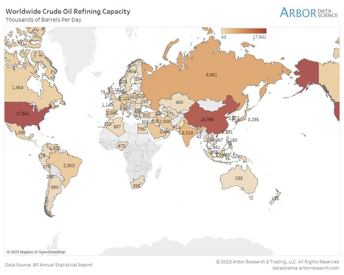 Парни из Arbor Data Science нарисовали такую картинку по поводу возможностей переработки сырой нефти в каждой отдельной стране.