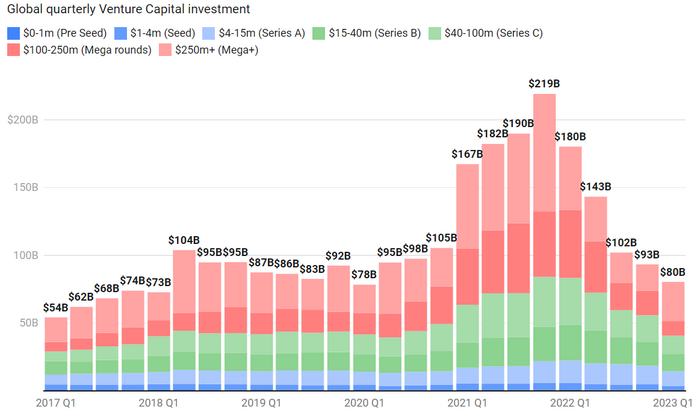 По данным европейской сети краудсорсинговых платформ Dealroom, в первом квартале 2023 года глобальный венчурный капитал достиг самого низкого уровня за последние три года. За первые три месяца 2023 года стартапы по всему миру привлекли $88 млрд по сравнению с пиком в $219 млрд в четвертом квартале 2021 года.