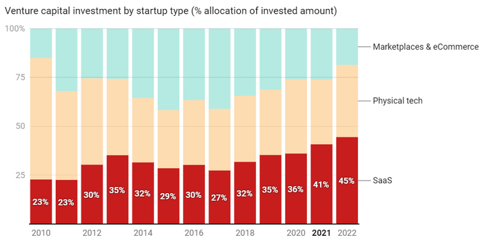 По отраслям лидируют облачные решения - 45% от всех инвестиций. Область «физических технологий» идет более-менее равномерно последние годы. А вот маркетплейсы и прочая е-коммерц с 17 года заметно теряет.