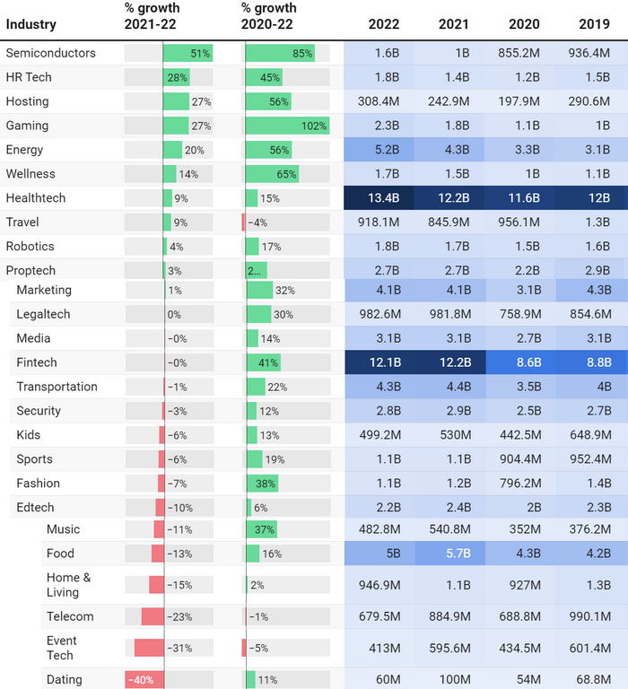 В плане географии произошли сильные изменения. Все типичные страны-стартаперы сильно пострадали: Великобритания (-27%), США (-35%) и даже Германия (-42%). С другой стороны, в Африке и Европе дела идут чрезвычайно хорошо - Хорватия лидирует, объем венчурного финансирования увеличился более чем на 350% от общего объема прошлого года, Кения не сильно отстает - чуть менее 300%. Причина? Низкие затраты (зарплата, недвижимость) + правительственные программы помощи стартапам.