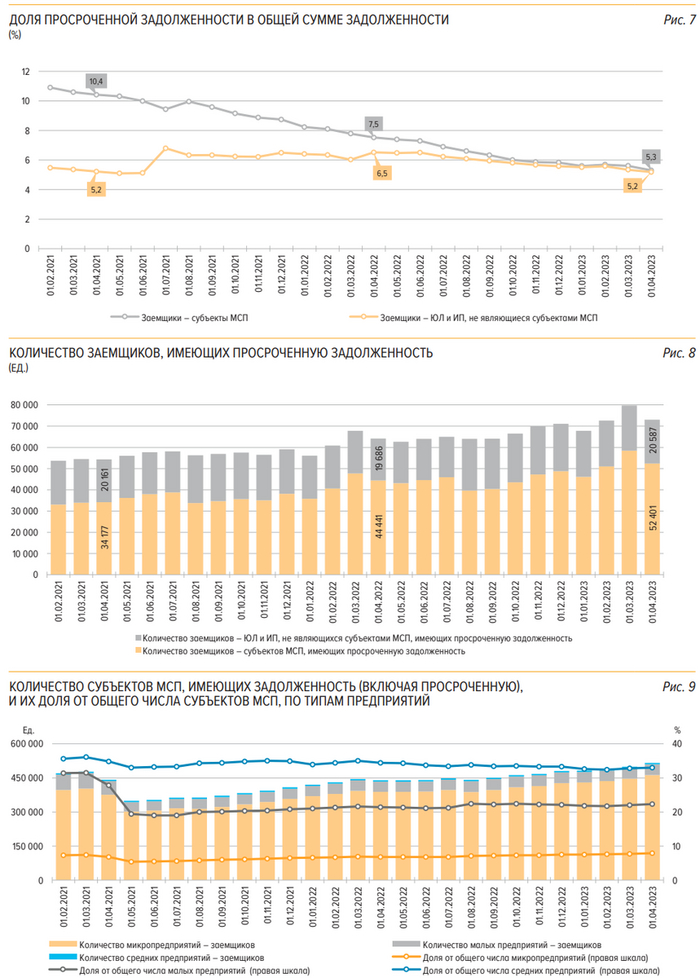 Просроченная задолженность по кредитам, предоставленным субъектам МСП, на 01.04.2023 уменьшилась по сравнению с предыдущей отчетной датой на 1,4% и составила 545 млрд руб., а также была ниже на 10,2% по сравнению со значением на 01.04.2022. Доля просроченной задолженности субъектов МСП в общей сумме задолженности была близка к аналогично му показателю заемщиков, не являющихся субъектами МСП (5,2% на 01.04.2023), и составила 5,3% (на 01.04.2022–7,5%). Всего по состоянию на 01.04.2023 число заемщиков, имеющих просроченную задолженность, составило 52 401, сократившись по сравнению с предыдущей отчетной датой на 10,4%.