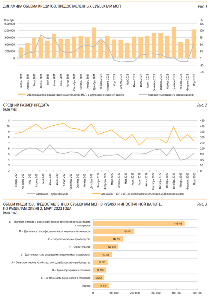 Средний размер кредита, предоставленного заемщику – субъекту МСП, в марте увели чился на 1 млн руб. по сравнению с февралем и составил 5,2 млн руб. Средний размер кредита заемщиков, не являющихся субъектами МСП, в марте 2023 г. был равен 266,5 млн руб.