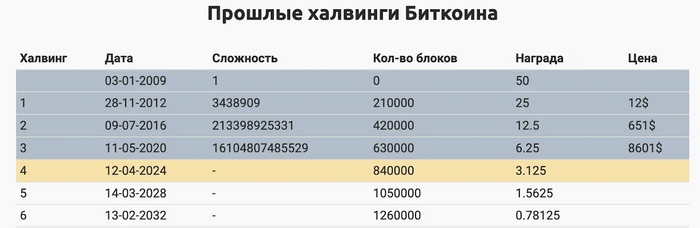 Халвинги происходят примерно раз в четыре года, это знаменует уполовинивание вознаграждения за каждый последующий добытый блок. В сети биткоина уже произошло три халвинга. От начала создания проекта, награда за один созданный блок составляла 50 BTC, первый халвинг — 25 BTC, далее — 12,5 BTC, и во время последнего 6,25 BTC. После следующего награда сократится до 3,125 BTC.