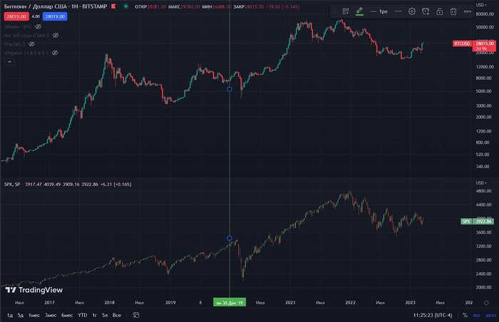 Сверху график BTC, снизу индекс S&P500. Таймфрейм 1 неделя