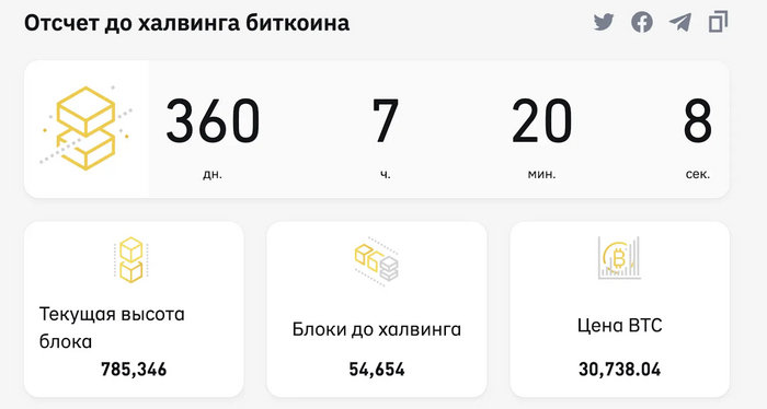 Возвращаемся к халвингам. Текущее вознаграждение за 1 добытый блок — 6,25 BTC. Следующий халвинг должен произойти ориентировочно в 2024 году.