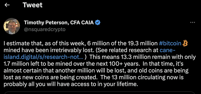 По заявлению аналитика Cane Island Alternative Advisors Тимоти Петерсона безвозвратно потеряны были 6 млн BTC. Исходя из этого он рассчитал, что осталось 13,3 млн, и только 1,7 млн предстоит добыть в течение следующих ста лет, а также будет потеряно еще около 1 млн BTC за это время. По итогу в обращении останется не более 14 млн.