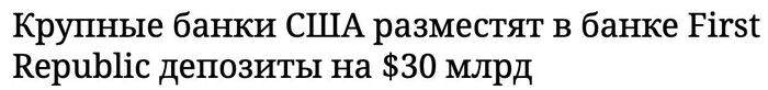 Индекс S&P500 вчера закрылся +1,76%. Основной драйвер для роста - предоставление финансовой помощи банку First Republic (фигурировал ранее как возможный претендент на дефолт).