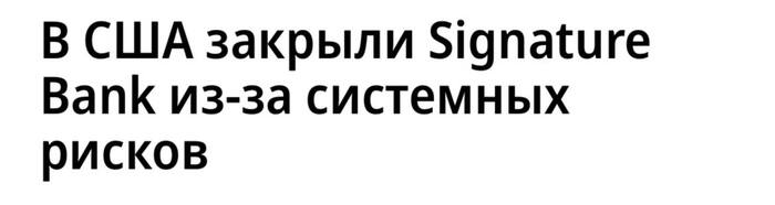 — Singnature Bank переходит под управление FDIC. Активы банка составляют 110 млрд $. Клиенты банка получат все свои средства.