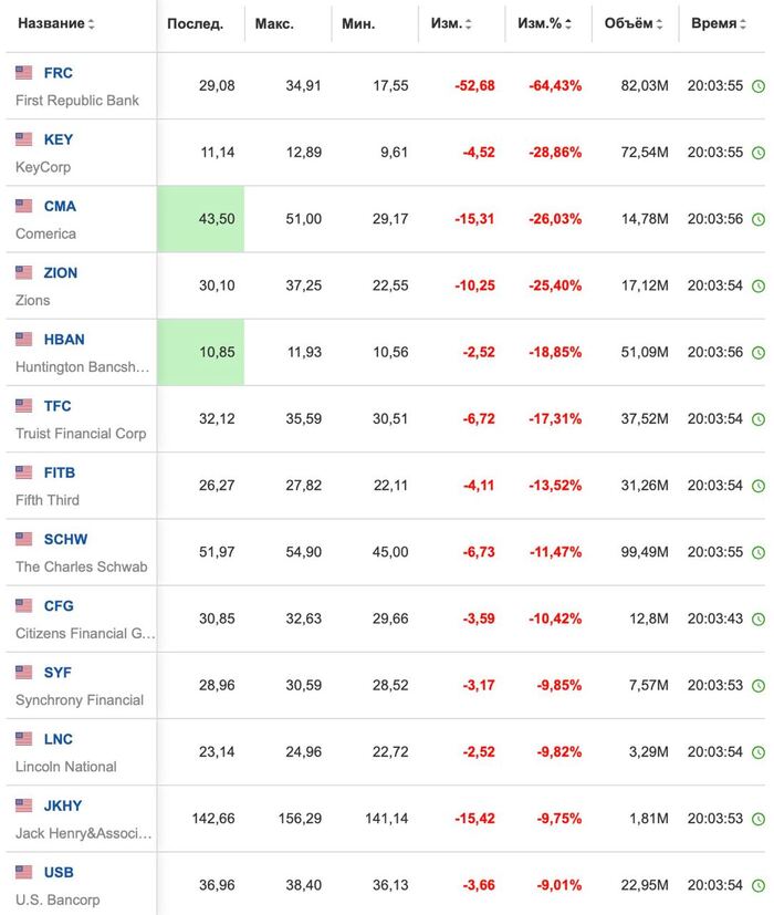 Продажи в бумагах First Republic Bank начались после того, как в США обанкротился крупнейший банк со времен кризиса 2008 года - Silicon Valley Bank (SVB).