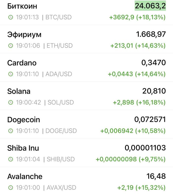 Резко начали свой рост защитные активы - золото и акции золотодобывающих компаний (фьючерсы на золото выросли на 5%). Кроме того, после краха двух банков США инвесторы ищут спасения в криптовалюте (BTC после падения до $19.500 вырос уже до 24.000 или на 23%).