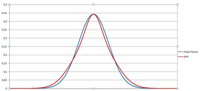 Подставляя (3) в (2) получим функцию распределения вероятностей на основе нормального распределения, но с более толстыми хвостами. Назовем ее «биржевое нормальное распределение» (БНР)