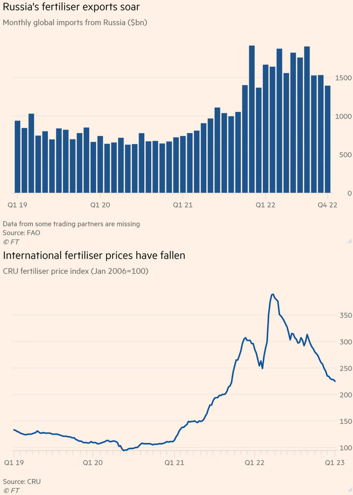 По данным ООН, за первые 10 месяцев 2022 российский экспорт удобрений подскочил на 70% до 16,7 млрд.$ по сравнению с тем же периодом 2021