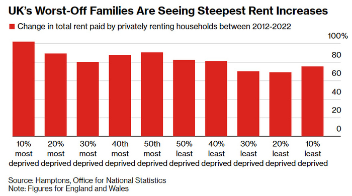 Беднейшие слои населения Великобритании столкнулись с самым серьезным ростом арендной платы. Так, за последнюю декаду (с 2012 по 2022) именно в "нижних" 10% населения (по достатку) стоимость аренды повысилась более чем вдвое. Ни в одной другой группе населения такого повышения не наблюдается.
