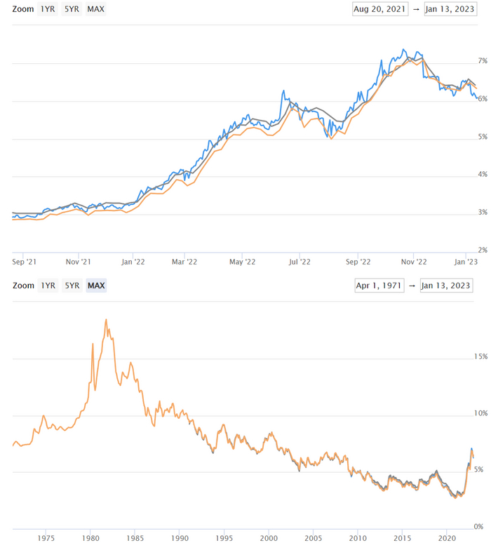 По разным опросам (MND, MBA, Freddie Mac) ставки по 30-летним фиксированным ипотекам колеблются от 6,09 до 6,42%. Максимальные ставки в прошлом году были показаны в конце октября - начале ноябре. Тогда они превышали 7%.