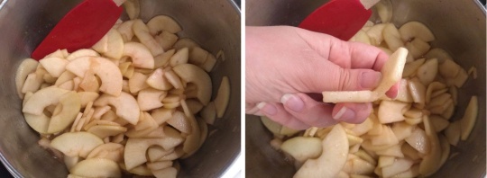 Уменьшите огонь до среднего и дайте яблокам нагреться около 10 минут, время от времени помешивая. Затем дайте им готовиться еще 10 минут, время от времени помешивая. Вы поймете, что они готовы, когда сможете согнуть ломтики, не сломав их.