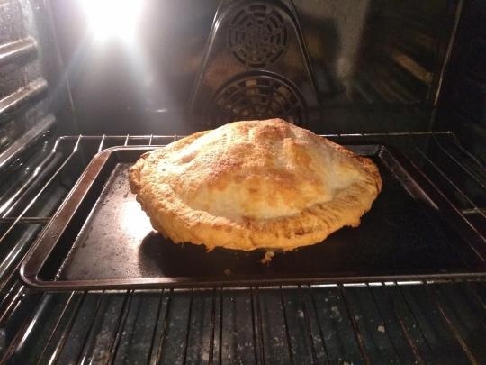 Выпекайте пирог, пока верх не станет золотисто-коричневым около 25 минут. Затем отрегулируйте температуру до 190 ℃, поверните противень на 180 градусов и продолжайте выпекать, пока корочка не станет золотисто-коричневой, 25–30 минут.