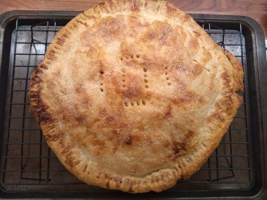 На посыпанной мукой рабочей поверхности раскатайте тесто в круг диаметром 30 см и поместите его поверх яблочной смеси. Чтобы запечатать края, начните с того, что загните верхнюю корку под нижнюю, насколько это возможно, не повреждая нижнюю корку. Затем с помощью вилки соедините вместе верхний и нижний слои.