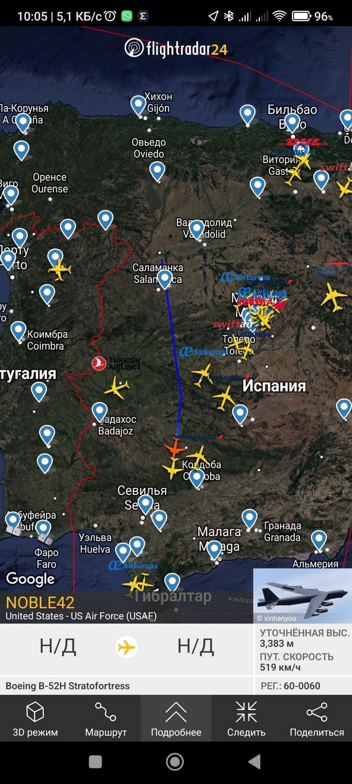 Несколько часов назад стратегический бомбардировщик НАТО Boeing B-52H Stratofortress вылетел из Норвегии, покрутился в Польше, полетел морем и вдруг зачем-то снизился до высоты примерно одного-двух километров (зеленый цвет трека на флайтрадаре это примерно 3000-6000 футов), развернулся на 90 градусов вправо и полетел ровнёхонько вдоль границы Калининградской области и Литвы. Потом набрал высоту до обычных 25 000 футов (7,6 км), развернулся через Литву, Латвию и полетел обратно.