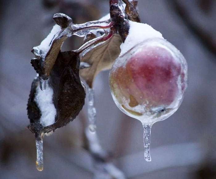 Не часто можно встретить такое необычное природное явление, которое называют: "Призрачные яблоки" или "Яблоки-призраки". Но иногда можно заметить довольно любопытную картину, когда вместо настоящего яблока на дереве провисает его полая ледяная форма. При этом создаётся впечатление, что на месте привычного яблока проявился его призрачный силуэт.