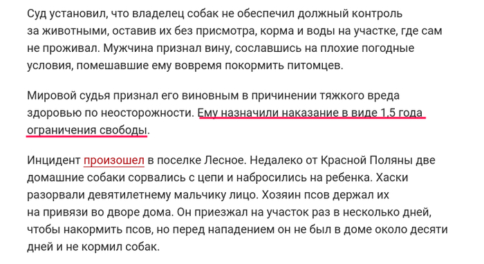 1,5 года лишения свободы получил хозяин хаски, растерзавших лицо мальчика в Сочи. Об этом 19 мая сообщает объединенная пресс-служба судов Краснодарского края.