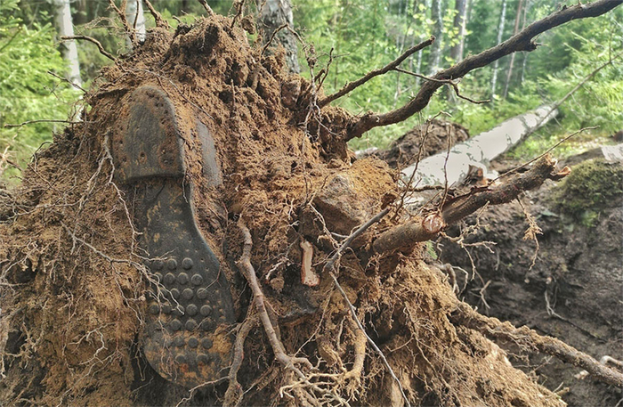 Бывает, что кто-то решил присесть на поваленное дерево, и это стало последней каплей: ствол у основания треснул, и образовавшийся пень, под действием натяжения в остатках корней, резко вернулся в изначальное положение – капкан захлопнулся.