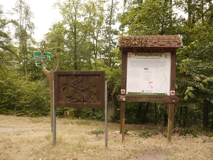 Информационный стенд и деревянная картина рядом с крестом. Скорее всего, крест поставлен не просто так, а здесь кто-то погиб, охотясь на этого самого кабанчика.