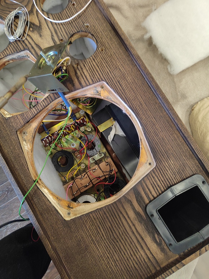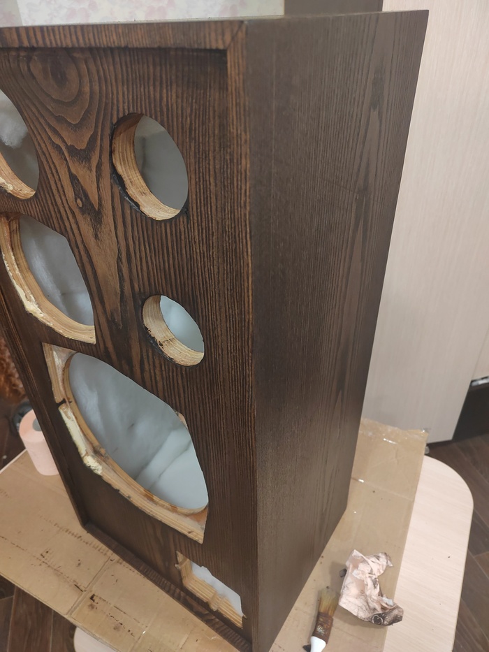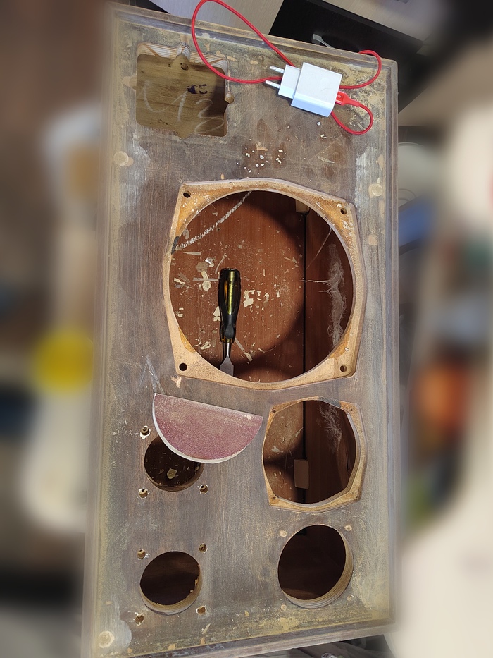 Первым делом снял динамики, фильтр и занялся проклейкой всего, что расклеилось, уборкой пластилина и шпатлёвкой углов. Оторванный угол усилен и восстановлен.