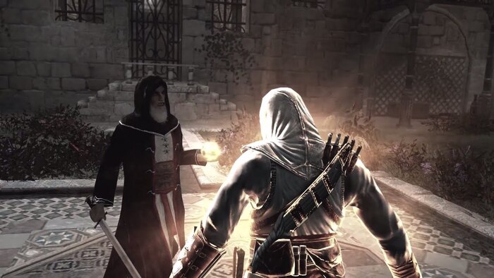 Сражения в Assassin's Creed - произведение батального искусства. В арсенал Альтаира входит длинный меч, короткий кинжал (он выезжает из левой руки персонажа) и метательные ножи. Юноша владеет ими мастерски. По заявлениям разработчиков, в распоряжении протагониста находится более десяти тысяч телодвижений. Вначале столь огромная цифра кажется фантастической, но практика доказывает правоту создателей. Киллер может красиво и вальяжно сражаться один на один, а может рьяно биться с целым отрядом. При этом выглядит асассин совершенно спокойно и равнодушно… до тех пор, пока кто-либо не заносит над ним клинок. Вот тут-то и настает кульминационный момент - ловким движением Альтаир уходит из-под удара и пронзает обидчика насквозь. Длится это всего несколько секунд, зато сколько вызывает эмоций! Каждый жест, каждый прием отточен до совершенства. Помимо обычных трюков в ходу и скрытные удары. Они применяются для незаметного уничтожения врагов. Альтаир совершает молниеносный бросок, и человек падает замертво. В толпе начинается паника, у стражи - переполох, а игрока распирает гордость за содеянное убийство. Великолепны и передвижения по городу. Альтаир - профессиональный акробат. Он способен покорить любую вершину, прыгнуть с огромной высоты, вскарабкаться по отвесной стене - лишь бы на поверхности были хоть какие-то выступы, за которые можно держаться. Особенно впечатляет так называемый прыжок веры. Взобравшись на верхотуру, протагонист сигает вниз, расставив руки в стороны, словно крылья. Время замедляется, вы наблюдаете окрестности с высоты птичьего полета, а камни мостовой неумолимо приближаются. Однако внизу всегда поджидает телега с соломой или стог сена, поэтому здоровью трюкача ничто не угрожает. Кстати, сено используется и как укрытие. Например, убегая от стражи, главный герой может забраться в стог и переждать погоню. А может усесться на скамейку и о чем-то задуматься, слившись с толпой. А еще он способен "вклиниться" в ряды монахов, одетых в белые рясы, и затеряться на их фоне.