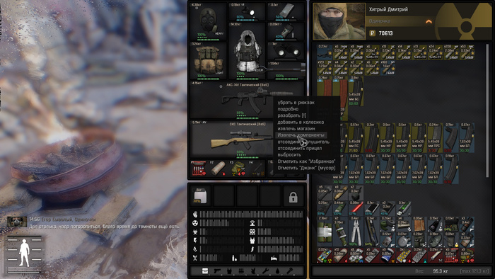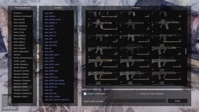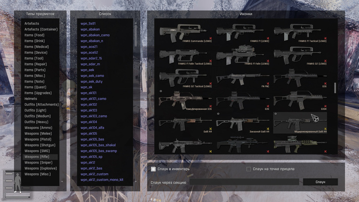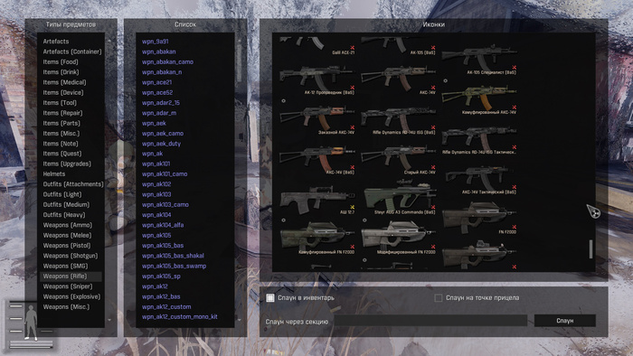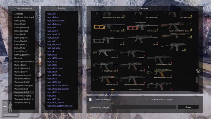 итак оружие, оружие, оружие. оружия в игре очень и очень много, представлены как ванильные образцы из Anomaly так и многие оружейные модпаки. Огромный вес арсенала приходится на пак от Boomstick&Sharpstick, так же присутствует оружейный пак из Contract Wars, он же дедушка таркова, и некоторые образцы из самого таркова. Оружие в игре подсчитать достаточно сложно, т.к. существуют как стоковые, так и тактические версии, если сказать примерно то больше 400 это точно. одних калашоидов всех сортов и калибров штук 50 не меньше.