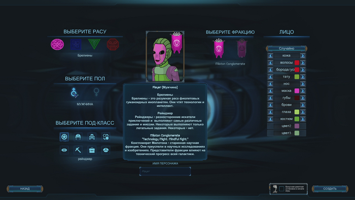 Как бы там ни было, перед спасением галактики, надо бы героя слепить достойного для такой важной миссии. Каждая из рас делится на два дома, и данный выбор повлияет на ваши стартовые отношения с другими домами в галактике. Тут могу сказать лишь одно: "Не важно что было в прошлом, главное что ждет впереди". Негативные эффекты от провала заданий или устранения члена фракции столь незначительны, что к концу игры все будут дружить со всеми. Выбор класса также влияет лишь на ваши первые шаги в игре. Корабль, оборудование и стартовый капитал, если угодно. Мой рейнджер к концу партии стал экспертом в области всего и на корабле шахтера в соло чистил целые сектора галактики. Настройки внешнего вида радуют своей вариативностью, хоть я и считаю что подобного рода куклы персонажей выбиваются из общего стиля игры.