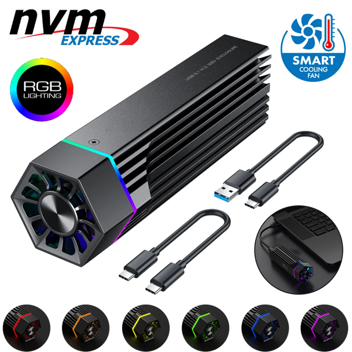 Корпус оснащен RGB-подсветкой с плавной сменой цветов. В комплекте два кабеля: USB-C на USB-A и USB-C на USB-C. Совместим с Windows, Mac и Linux. Не поддерживает SATA M.2 и mSATA накопители.