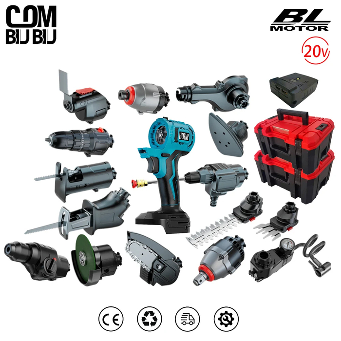 Универсальная система электроинструментов, работающая от аккумуляторов Makita 18В серии B (BL1850B, BL1840B, BL1830B и других). В основе лежит бесщеточный "хост" мощностью 21В с тремя скоростными режимами: 13000/20000/24000 об/мин. К нему подключаются различные насадки: дрель-шуруповерт с патроном 10 мм и крутящим моментом до 35 Нм, угловая шлифмашина, цепная пила 4 дюйма, сабельная пила, полировщик и даже мойка высокого давления.