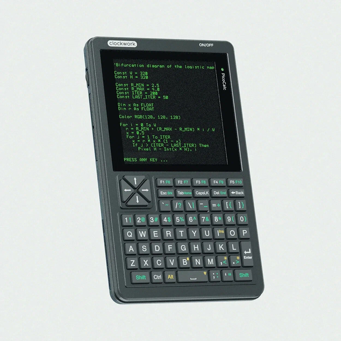 Компактный программируемый терминал на базе Raspberry Pi Pico H с микроконтроллером RP2040. Оснащен 4-дюймовым IPS-дисплеем с разрешением 320×320 пикселей, QWERTY-клавиатурой с подсветкой из 67 клавиш и стереодинамиками. Размеры устройства — 167 × 97 мм.