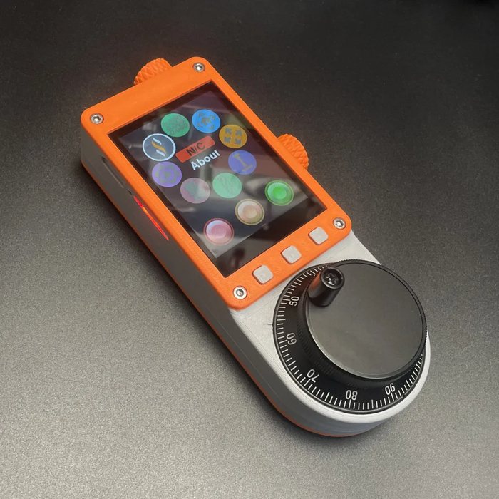 Беспроводной контроллер для управления станками с ЧПУ на базе прошивок FluidNC / grblHAL и микроконтроллера ESP32. Оснащен емкостным сенсорным экраном, промышленным энкодером и тремя независимыми переключателями. Размеры — 165 × 60 мм, вес — 365 г. Питание от аккумулятора 18650 с плоским верхом (не входит в комплект) с индикатором заряда.