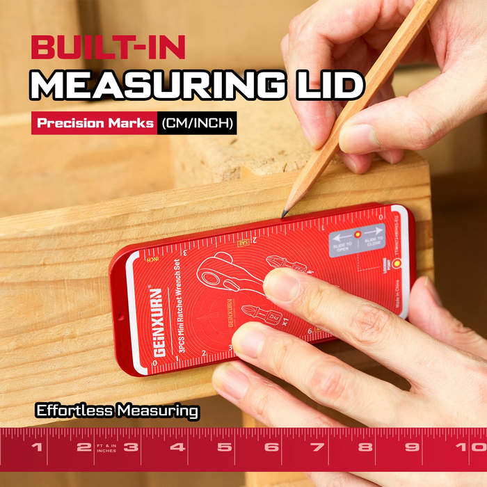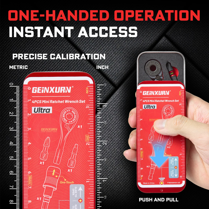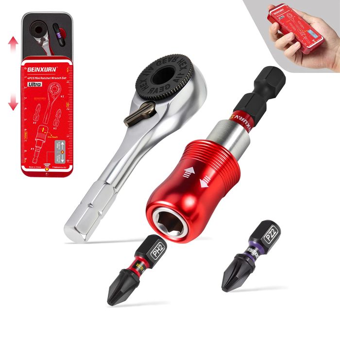 Компактный набор инструментов с храповым механизмом профессионального уровня. Размеры кейса — 110 × 45 × 20 мм, что позволяет носить его в кармане. Биты изготовлены из легированной стали S2 с термообработкой, обеспечивающей твердость и долговечность для промышленного использования.