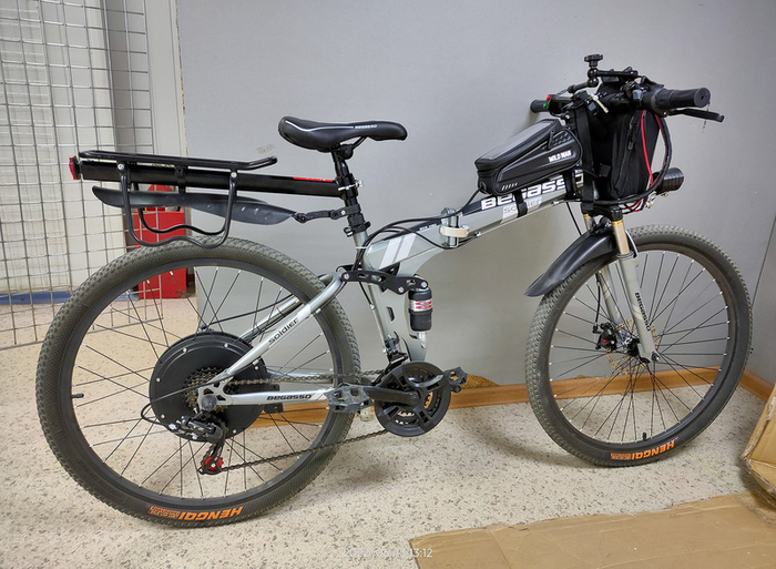Полноценный электрический горный велосипед с парой моторов суммарной мощностью 2000 Вт. Оснащен батареей на 17.5 Ач, обеспечивающей пробег в 50 км. На подзарядку от 0 до 100% уходит 7 - 8 часов.