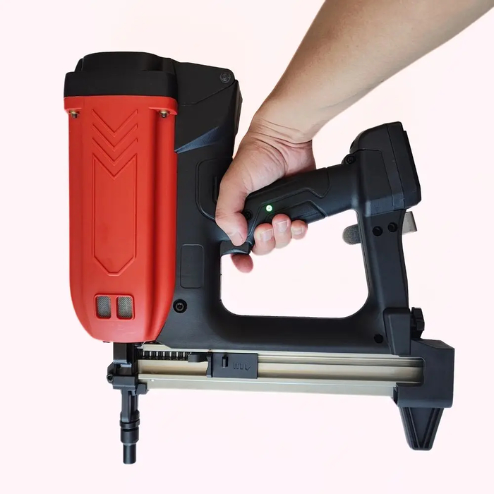 Пневматический молоток или, как его еще называют, гвоздострел. Инструмент, который сильно ускорят и облегчает строительные работы и сборку мебели. Данный экземпляр не требует подключения к компрессору, а работает от батареи, которой хватает на 2000 гвоздей. В комплекте также идут инструменты для разбора, защитные очки, насадки для регуляции мощности, смазка и сумка. Совместим с гвоздями длиной от 19 до 38 мм и диаметром шляпки 6 мм.