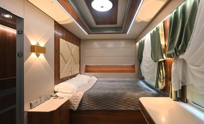 Первые рейсы уже в этом месяце, а в самом купе: отдельная зона с двуспальной кроватью, душевая, рабочий стол и гостевая зона.