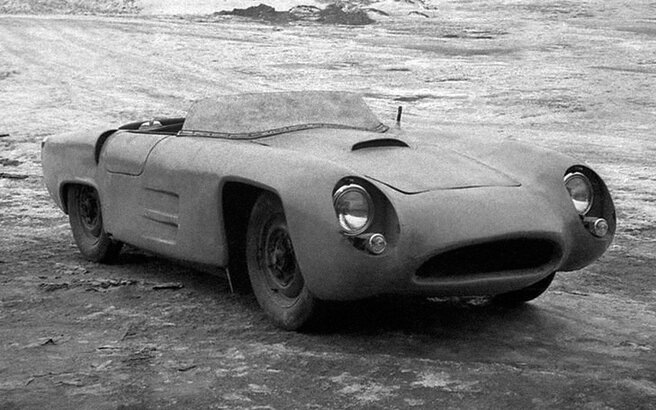 Ниже машина-ракета. В прямом смысле. На дворе 50-е. Горьковский завод. Движок от истребителя. 1000 лошадей, алюминиевый корпус. Вместо тормозов - парашют. За рулём двукратный чемпион СССР Метелев.