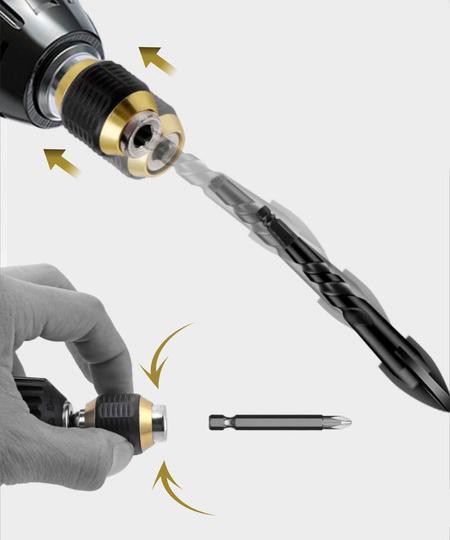 Позволяет одним нажатием осуществлять смену оснастки (обычно замену сверл и бит для шуруповерта), при этом они садятся плотно и надежно фиксируются внутри.
