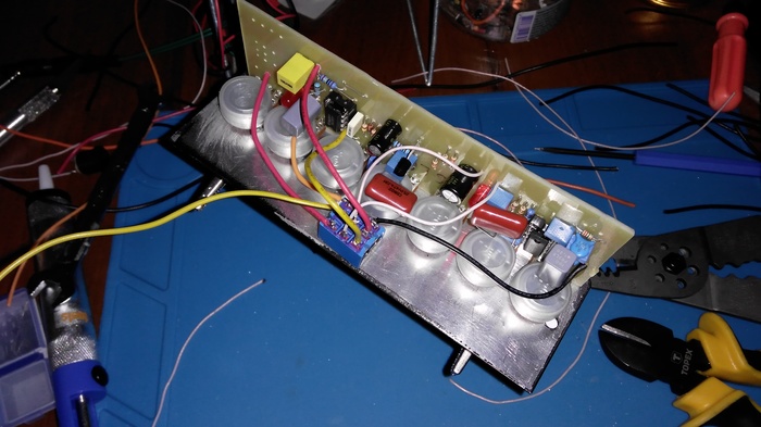 Можно переходить к пайке комплектухи на плату. На фото уже почти все впаяно. Так как не было под рукой мелких конденсаторов, то пришлось соорудить некоторый навес =)