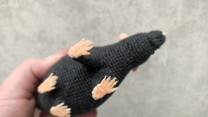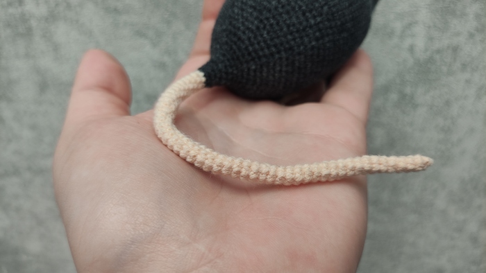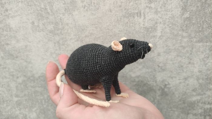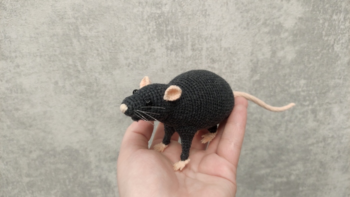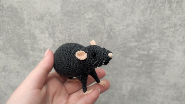 А почему же тогда миниатюра? Потому что связана крыса из очень тонкой пряжи. Вероятно, это будет интересно только вязальщикам, но все же укажу, что крыса вязалась из разделенной надвое пряжей ярнарт джинс. А лапки из разделенного джинса на 4 нити! Использовала крючки 1.25, 1 и 0.75.