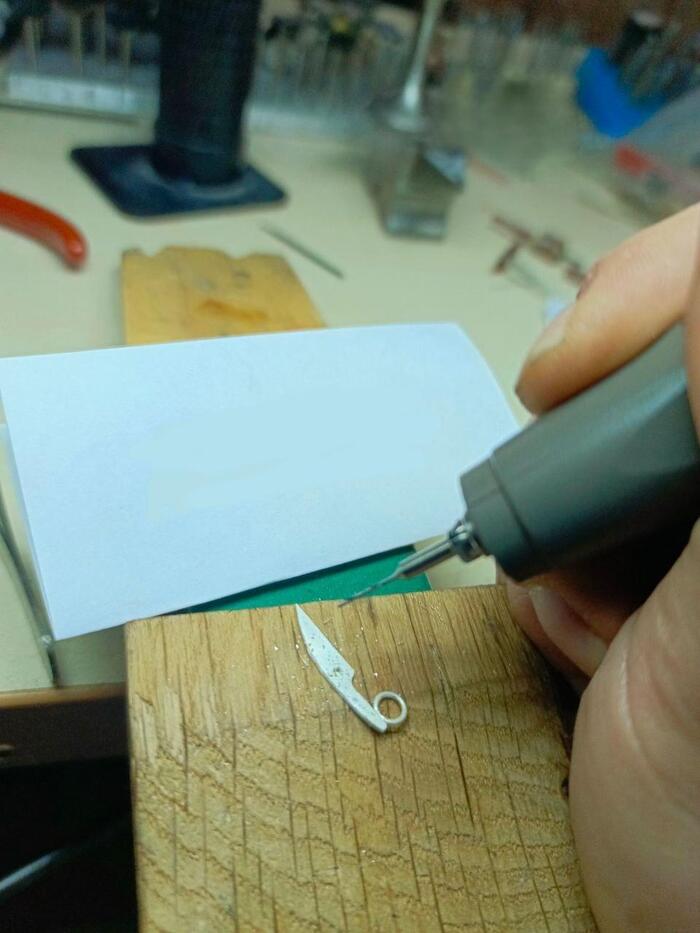 Дальше мне надо соединить две заготовки, что все было как у настоящих ножниц. Для этого я просверлила их и заштифтовала обе части, проволока 0,8мм: