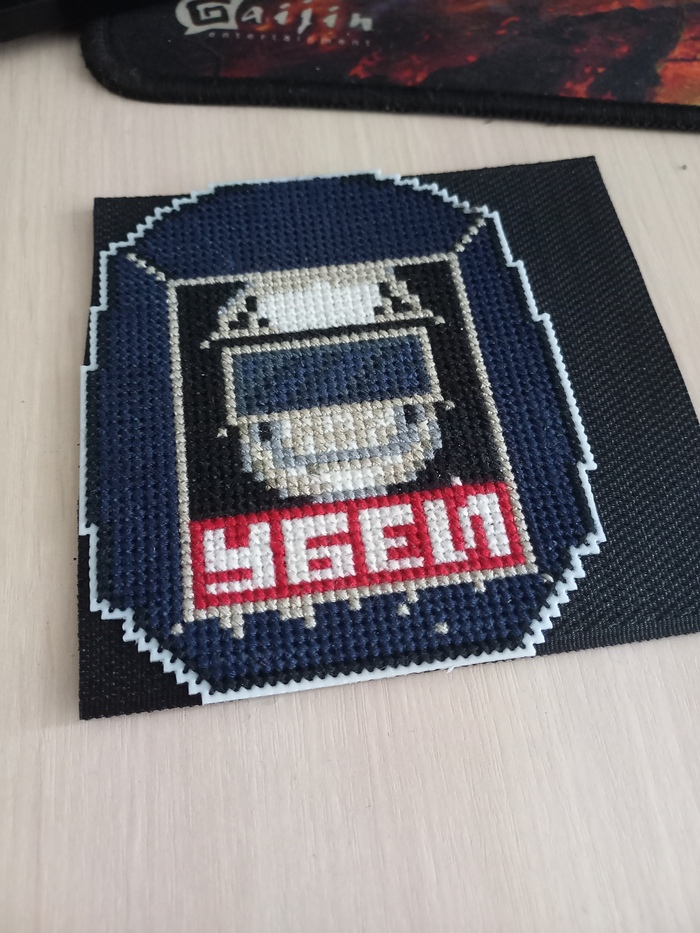 А нужны ли тут фото процесса? Вот тогда две фоточки. Вышивал на пластиковой канве, но для шеврона пластик такое себе... но с заказчиком договорились так.