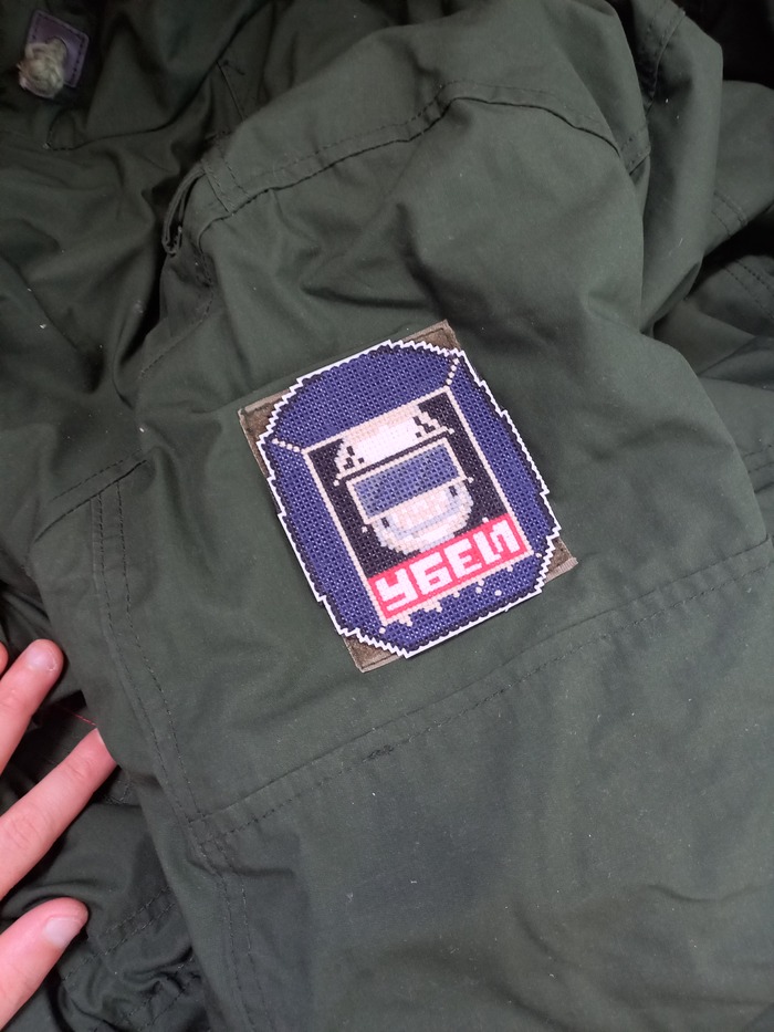 После вышивки и вырезания, приклеил на липкую ленту, примерил на свой старый военный бушлат, вроде держится и не плохо.