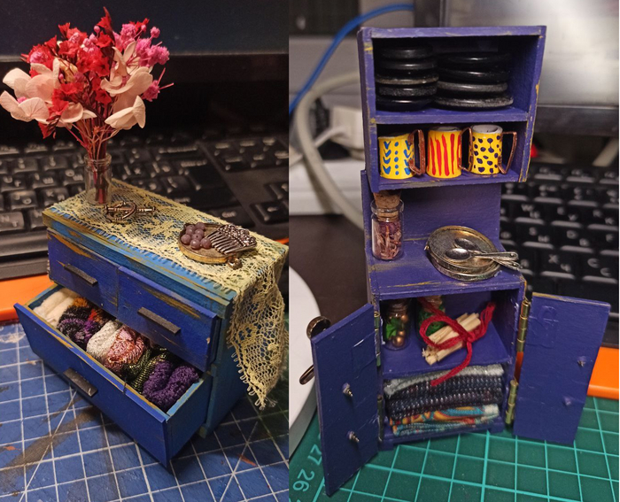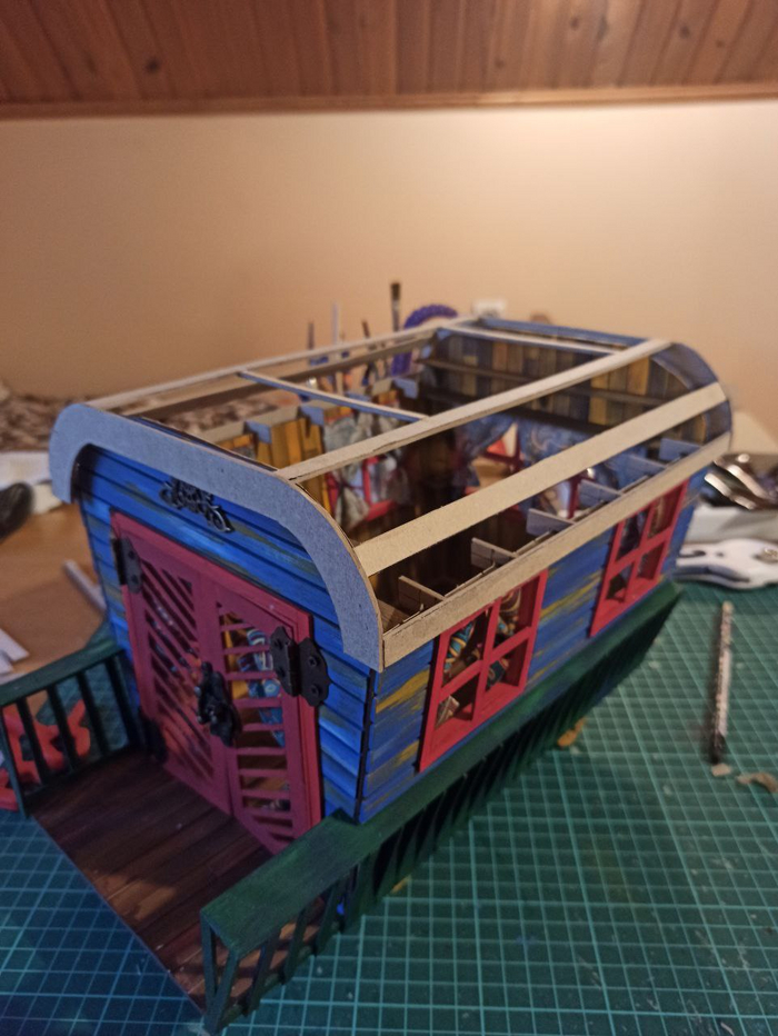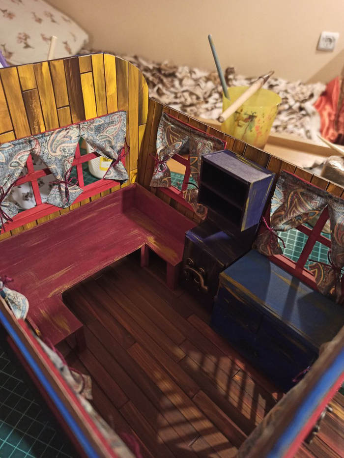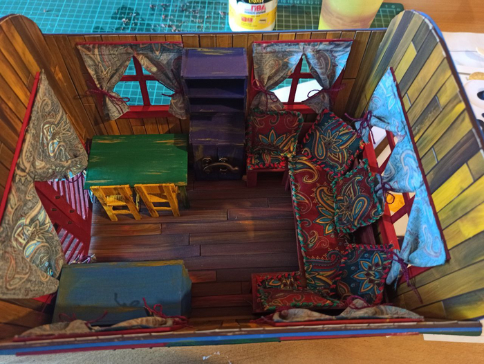 Из-за того, что тележка сделана в подарок друзьям с маленьким ребенком, я не приклеивала в этот раз намертво мебель и сделала съемную крышу для того, чтобы с изделием можно было играть (но очень аккуратно, а то оно все какое-то нежное...). Однако содержимое шкафов, полок, ящиков и т.д. все-таки приклеено. Иначе бы оно вечно падало и сбивалось.