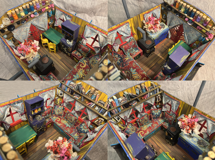 Я думала все стены уставить книгами, но меня хватило только на одну сторону. Вторая же оказалась в итоге для зелий. Надеюсь, я хорошо заклеила баночки, а то в них краска с мхом, бусинами и еще черт знает чем... и если это все прольется, то мало тележке не покажется!