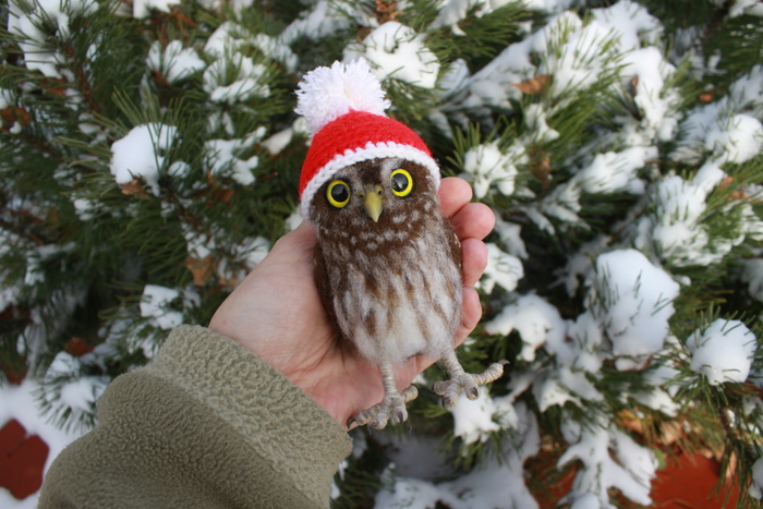 Воробьиный сыч - один из любимых видов птиц для повтора на заказ. Выполнен в технике сухого валяния из овечьей шерсти, лапки на проволочном каркасе, подвижные, глаза - стекло, клюв и когти - полимерная глина Fimo. Шапочка вязанная крючком специально для сычика, идёт в комплекте.