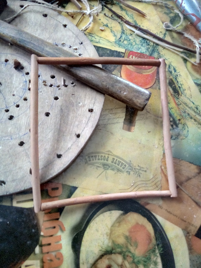 Собираем рамку на гвоздики. Обычно, без гвоздиков, сразу заплетаем углы. Тут для чистоты эксперимента используем «новшества » – гвоздики.