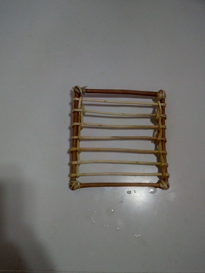 Далее можно плести одним прутом, один через один. Я начну верёвочной, с двух сторон подтягивая и прожимая стойки.